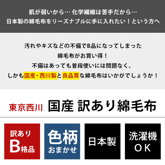 こちらの綿毛布は、商品によって毛足の長めのもの、短いものがこざいますので、複数ご購入いただいた場合に風合いや触り心地に差を感じることがあります。